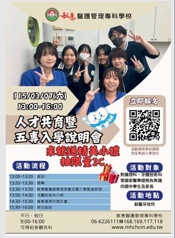| 主旨: | 敏惠醫專與創藝牙體技術所舉辦人才共育暨五專入學說明會,敬邀貴校師長、學生、家長報名參加。 |