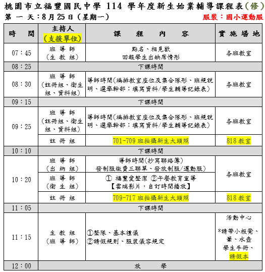 本校將於114年8月25日-26日辦理114學年度新生始業輔導,詳細事項請參考下方兩圖。