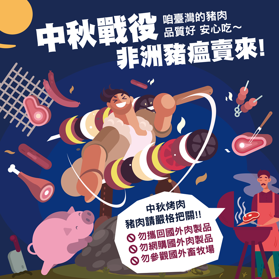 | 二、 | 中秋節前後是旅客攜帶、貨運快遞及國際郵包違規輸入動物產品數量的最高峰,尤其是境外輸入的含豬肉月餅是違規產品的大宗,也是傳入非洲豬瘟的最大風險來源,呼籲務必要告知國外親友切勿寄送含豬肉月餅或禮品到臺灣,共同維護我國非洲豬瘟非疫區之難得成果。 |